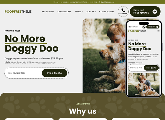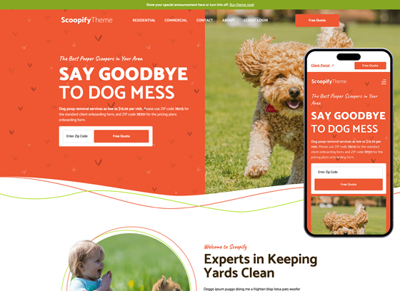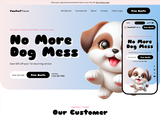 PoopFree Theme is a modern, high-performing WordPress theme designed specifically for the pet waste removal industry.